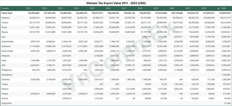 Từ năm 2011 đến 2025, xuất khẩu chè của Việt Nam ghi nhận nhiều biến động, với tổng giá trị xuất khẩu đạt đỉnh vào